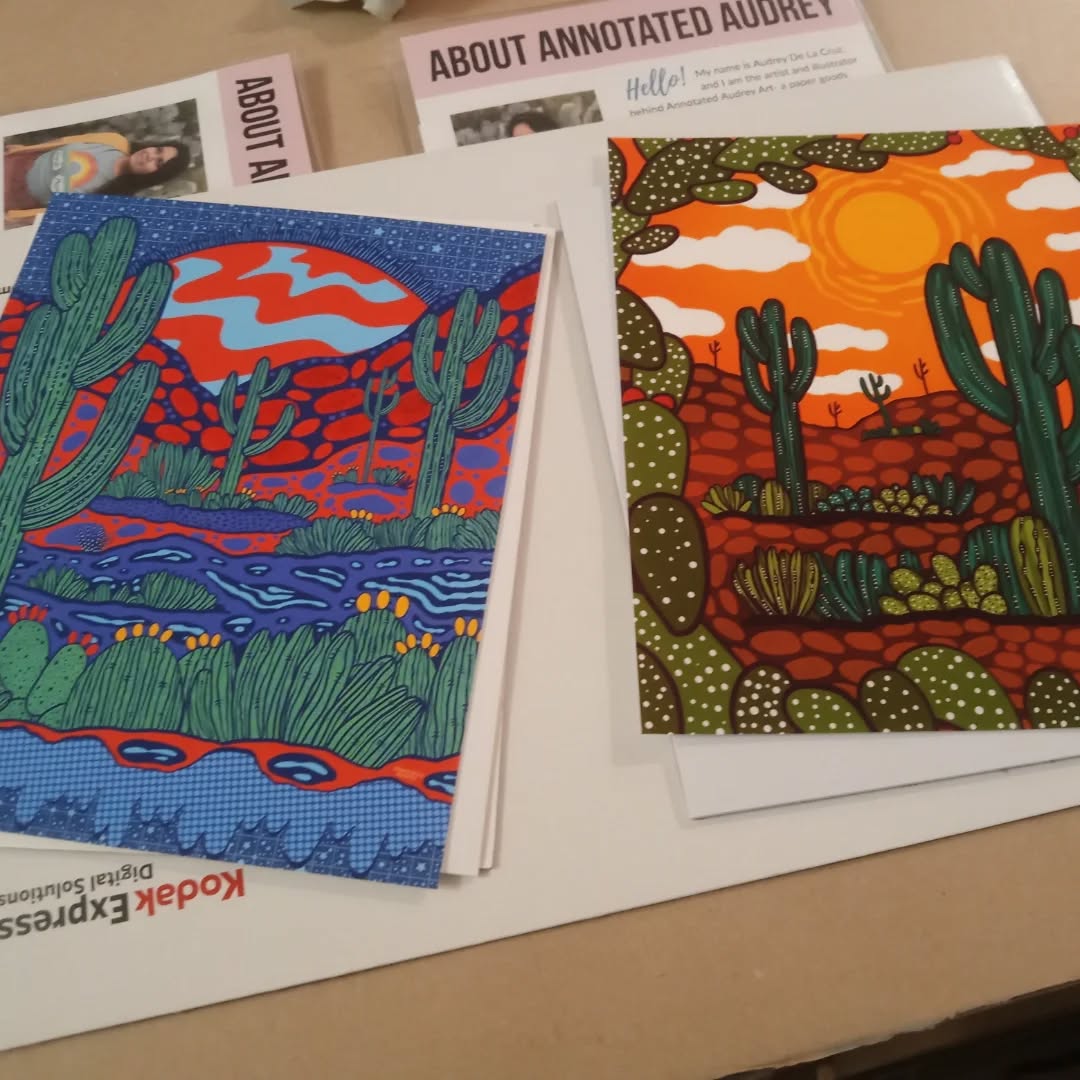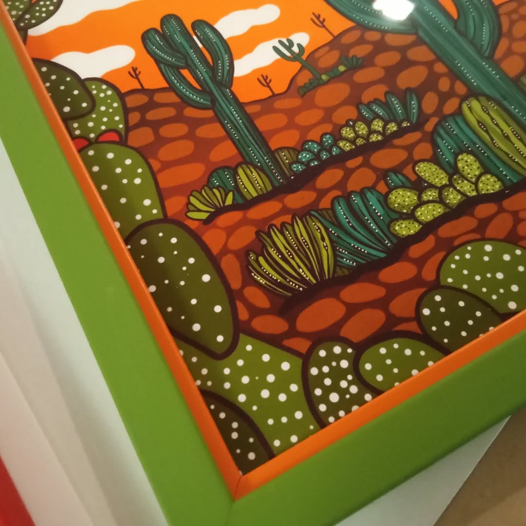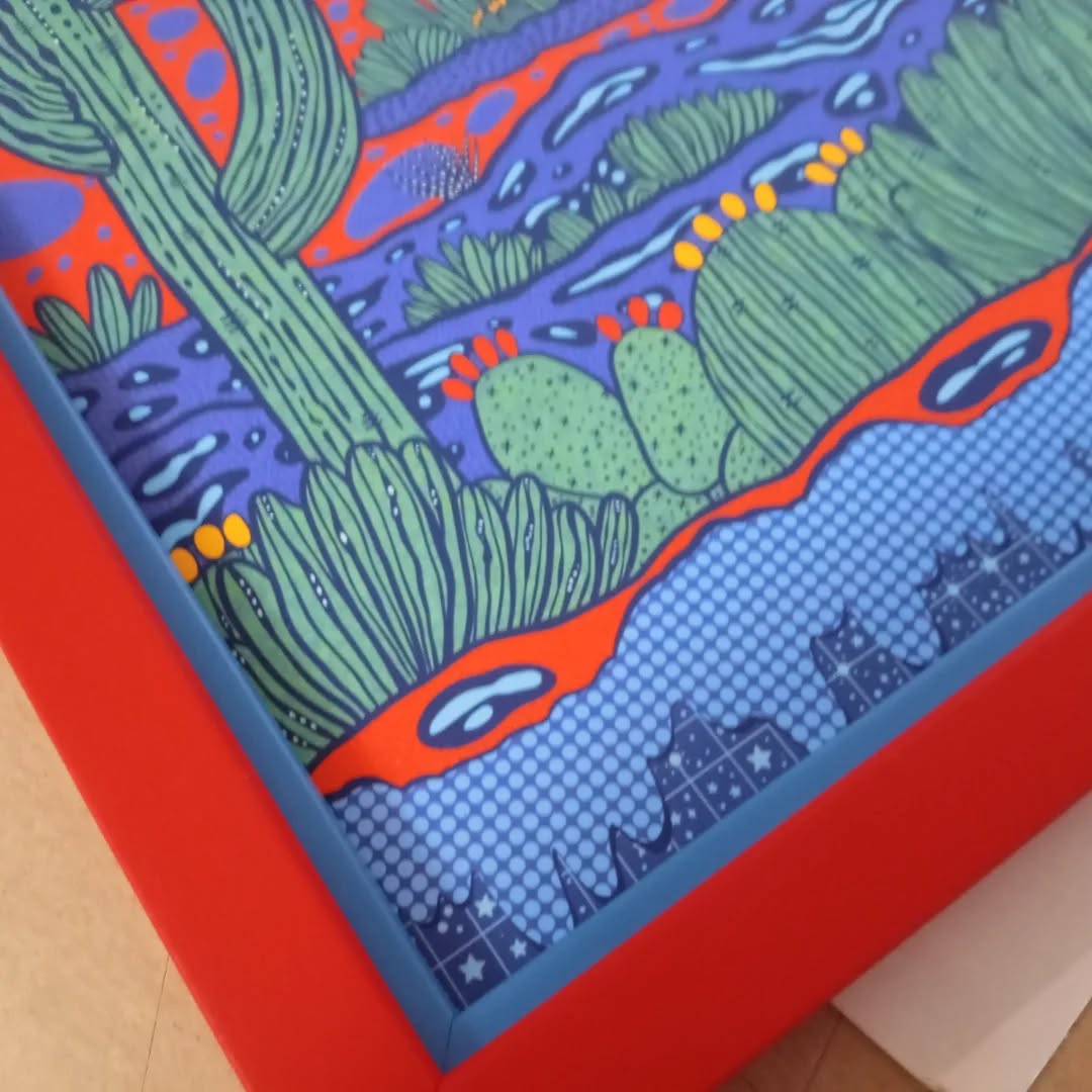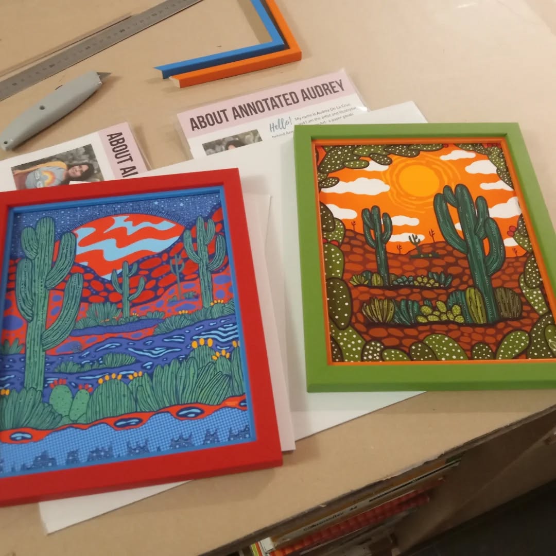 Deux jolis prints d’une artiste que je ne connaissais pas. ANNOTATED AUDREY ! Elle illustre les paysages naturels de l’Arizona. Deux encadrements simplement rehaussés d’une petite Marie Louise en couleur suffisent à les mettre en valeur. ![]()